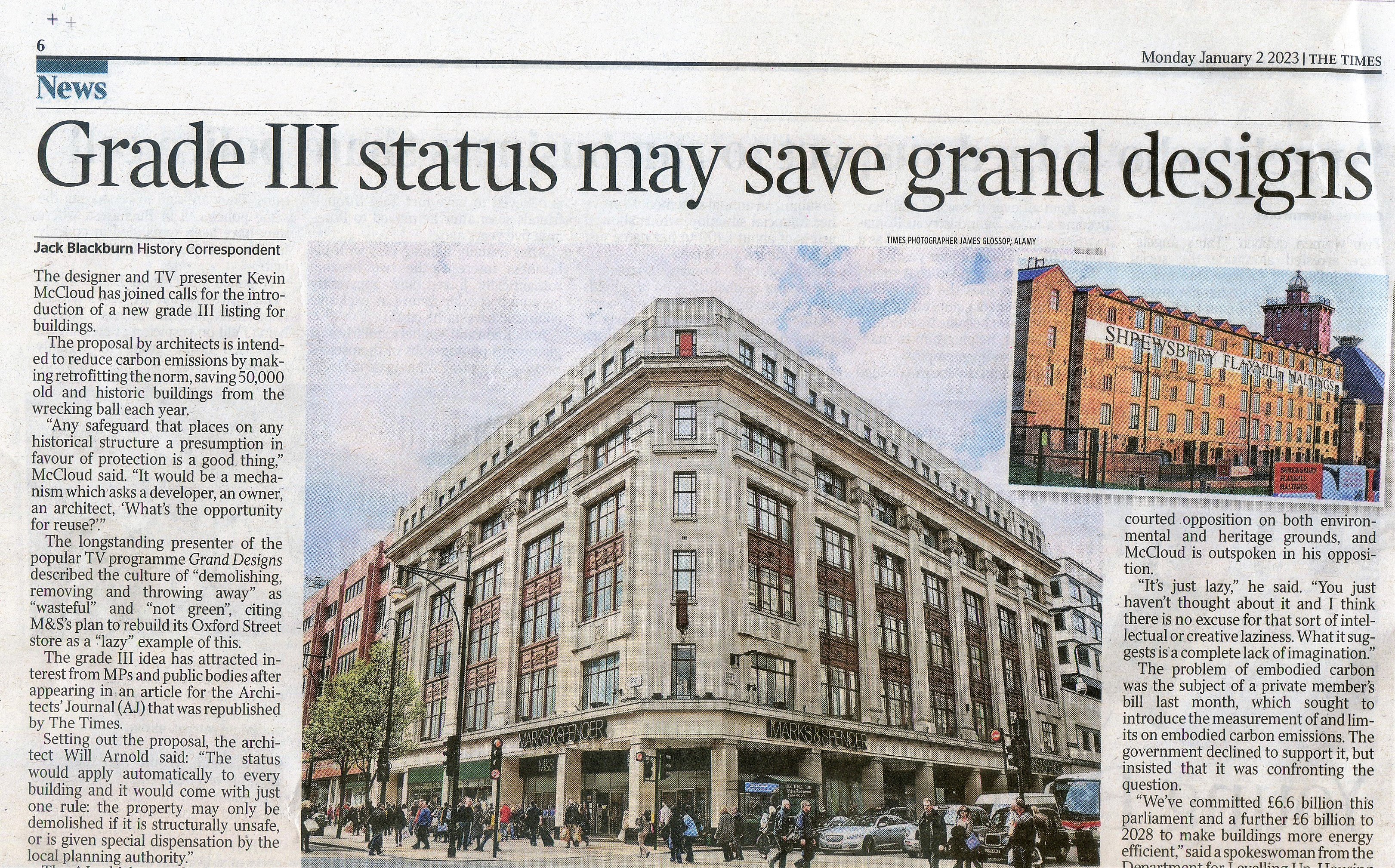 This is a follow-up to The Times article of Monday 2nd Jan 2023 where Kevin McCloud of the TV programme Grand Designs calls for a halt to the demolition of buildings like the M&S building in Oxford Street because of the unnecessary level of carbon emissions in demolition and rebuilding.
